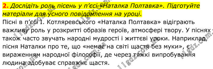 Дослідіть роль пісень у п’єсі «Наталка Полтавка». Підготуйте матеріали для усного повідомлення на уроці. Пісні в п’єсі І. Котляревського «Наталка Полтавка» відіграють важливу роль у розкритті образів героїв, атмосфері твору. У піснях також часто звучать народні мудрості і життєві уроки. Наприклад, пісня Наталки про те, що «немає на світі щастя без муки», є вираженням народної філософії, де через тяжкі випробування людина здобуває справжнє щастя.