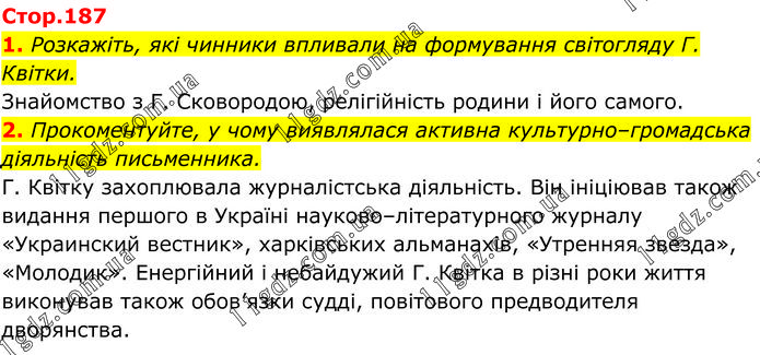 1. Розкажіть, які чинники впливали на формування світогляду Г. Квітки. Знайомство з Г. Сковородою, релігійність родини і його самого. 2. Прокоментуйте, у чому виявлялася активна культурно–громадська діяльність письменника. Г. Квітку захоплювала журналістська діяльність. Він ініціював також видання першого в Україні науково–літературного журналу «Украинский вестник», харківських альманахів, «Утренняя звезда», «Молодик». Енергійний і небайдужий Г. Квітка в різні роки життя виконував також обов’язки судді, повітового предводителя дворянства.