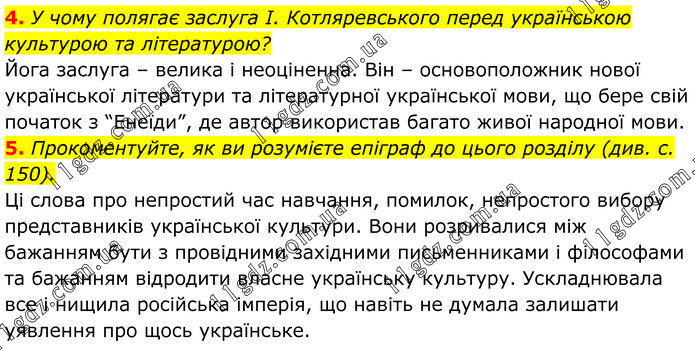 4. У чому полягає заслуга І. Котляревського перед українською культурою та літературою? Йога заслуга – велика і неоціненна. Він – основоположник нової української літератури та літературної української мови, що бере свій початок з “Енеїди”, де автор використав багато живої народної мови. 5. Прокоментуйте, як ви розумієте епіграф до цього розділу (див. с. 150). Ці слова про непростий час навчання, помилок, непростого вибору представників української культури. Вони розривалися між бажанням бути з провідними західними письменниками і філософами та бажанням відродити власне українську культуру. Ускладнювала все і нищила російська імперія, що навіть не думала залишати уявлення про щось українське.