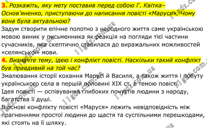 3. Розкажіть, яку мету поставив перед собою Г. Квітка–Основ’яненко, приступаючи до написання повісті «Маруся». Чому вона була актуальною? Задум створити епічне полотно з народного життя саме українською мовою виник у письменника як реакція на погляди тієї частини сучасників, яка скептично ставилася до виражальних можливостей «селянської» мови. 4. Визначте тему, ідею і конфлікт повісті. Наскільки такий конфлікт був правдивий на той час? Змалювання історії кохання Марусі й Василя, а також життя і побуту українського села в першій половині ХІХ ст. є темою повісті. Ідея повісті — оспівування глибоких почуттів людини з народу, багатства її душі. В основі конфлікту повісті «Маруся» лежить невідповідність між прагненнями простої людини до щастя та суспільними перешкодами, які стоять на її шляху.