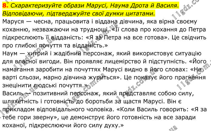 Схарактеризуйте образи Марусі, Наума Дрота й Василя. Відповідаючи, підтверджуйте свої думки цитатами. Маруся — чесна, працьовита і віддана дівчина, яка вірна своєму коханню, незважаючи на труднощі. «Її слова про кохання до Петра підкреслюють її відданість: «Я за Петра на все готова». Це свідчить про глибокі почуття та відданість.» Наум — хитрий і жадібний персонаж, який використовує ситуацію для власної вигоди. Він проявляє лицемірство й підступність. «Його намагання заробити на почуттях Марусі видно в його словах: «Не варті сльози, марно дівчина журиться». Це показує його прагнення знецінити людські почуття.» Василь — позитивний персонаж, який представляє собою силу, шляхетність і готовність до боротьби за щастя Марусі. Він є прикладом відповідального чоловіка. «Коли Василь говорить: «Я за тебе гори зверну», це демонструє його готовність на все заради коханої, підкреслюючи його силу духу.»