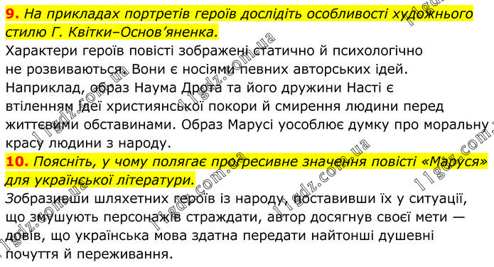 9. На прикладах портретів героїв дослідіть особливості художнього стилю Г. Квітки–Основ’яненка. Характери героїв повісті зображені статично й психологічно не розвиваються. Вони є носіями певних авторських ідей. Наприклад, образ Наума Дрота та його дружини Насті є втіленням ідеї християнської покори й смирення людини перед життєвими обставинами. Образ Марусі уособлює думку про моральну красу людини з народу. 10. Поясніть, у чому полягає прогресивне значення повісті «Маруся» для української літератури. Зобразивши шляхетних героїв із народу, поставивши їх у ситуації, що змушують персонажів страждати, автор досягнув своєї мети — довів, що українська мова здатна передати найтонші душевні почуття й переживання.