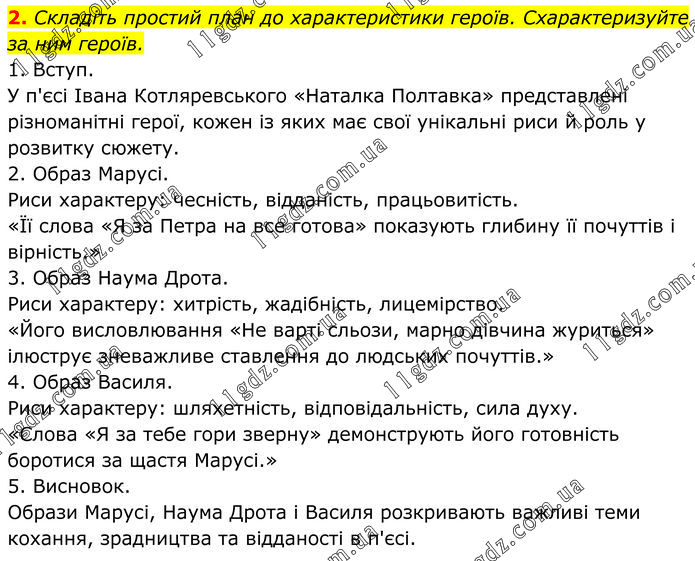Складіть простий план до характеристики героїв. Схарактеризуйте за ним героїв. 1. Вступ. У п'єсі Івана Котляревського «Наталка Полтавка» представлені різноманітні герої, кожен із яких має свої унікальні риси й роль у розвитку сюжету. 2. Образ Марусі. Риси характеру: чесність, відданість, працьовитість. «Її слова «Я за Петра на все готова» показують глибину її почуттів і вірність.» 3. Образ Наума Дрота. Риси характеру: хитрість, жадібність, лицемірство. «Його висловлювання «Не варті сльози, марно дівчина журиться» ілюструє зневажливе ставлення до людських почуттів.» 4. Образ Василя. Риси характеру: шляхетність, відповідальність, сила духу. «Слова «Я за тебе гори зверну» демонструють його готовність боротися за щастя Марусі.» 5. Висновок. Образи Марусі, Наума Дрота і Василя розкривають важливі теми кохання, зрадництва та відданості в п'єсі.