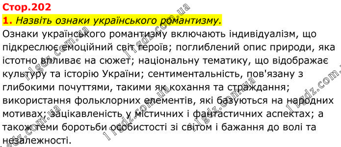 Назвіть ознаки українського романтизму. Ознаки українського романтизму включають індивідуалізм, що підкреслює емоційний світ героїв; поглиблений опис природи, яка істотно впливає на сюжет; національну тематику, що відображає культуру та історію України; сентиментальність, пов'язану з глибокими почуттями, такими як кохання та страждання; використання фольклорних елементів, які базуються на народних мотивах; зацікавленість у містичних і фантастичних аспектах; а також теми боротьби особистості зі світом і бажання до волі та незалежності.