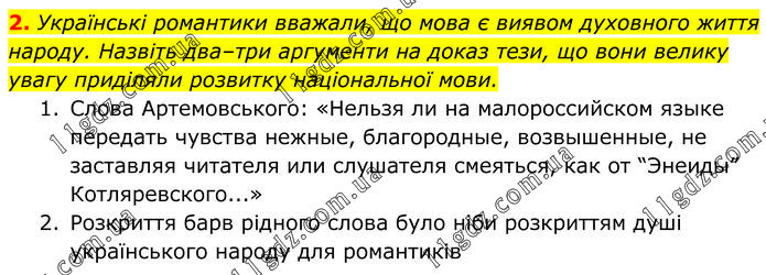 Українські романтики вважали, що мова є виявом духовного життя народу. Назвіть два–три аргументи на доказ тези, що вони велику увагу приділяли розвитку національної мови. 1. Слова Артемовського: «Нельзя ли на малороссийском языке передать чувства нежные, благородные, возвышенные, не заставляя читателя или слушателя смеяться, как от “Энеиды” Котляревского...» 2. Розкриття барв рідного слова було ніби розкриттям душі українського народу для романтиків.