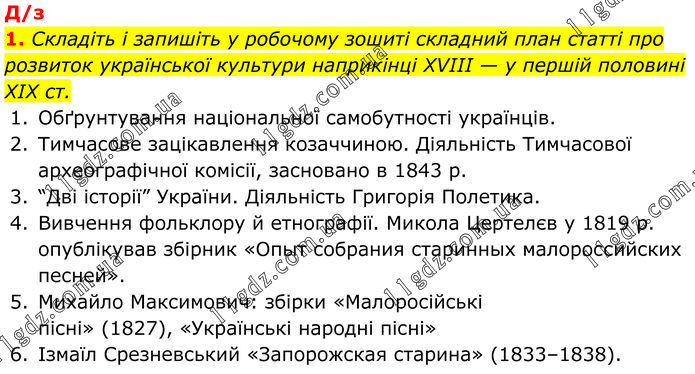 Складіть і запишіть у робочому зошиті складний план статті про розвиток української культури наприкінці XVIII — у першій половині ХІХ ст. 1. Обґрунтування національної самобутності українців. 2. Тимчасове зацікавлення козаччиною. Діяльність Тимчасової археографічної комісії, засновано в 1843 р. 3. “Дві історії” України. Діяльність Григорія Полетика. 4. Вивчення фольклору й етнографії. Микола Цертелєв у 1819 р. опублікував збірник «Опыт собрания старинных малороссийских песней». 5. Михайло Максимович: збірки «Малоросійські. пісні» (1827), «Українські народні пісні». 6. Ізмаїл Срезневський «Запорожская старина» (1833–1838).