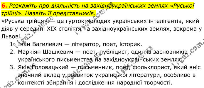 Розкажіть про діяльність на західноукраїнських землях «Руської трійці». Назвіть її представників. «Руська трійця» — це гурток молодих українських інтелігентів, який діяв у середині XIX століття на західноукраїнських землях, зокрема у Львові. 1. Іван Вагилевич — літератор, поет, історик. 2. Маркіян Шашкевич — поет, публіцист, один із засновників українського письменства на західноукраїнських землях. 3. Яків Головацький — письменник, поет, фольклорист, який вніс значний вклад у розвиток української літератури, особливо в контексті збирання і дослідження народної творчості.