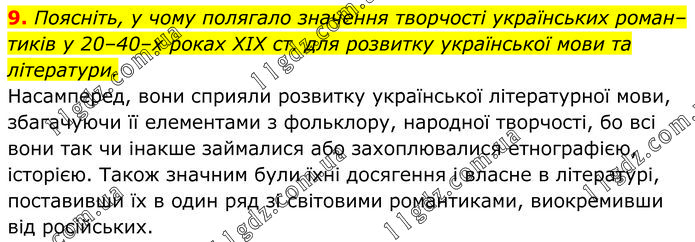 Поясніть, у чому полягало значення творчості українських романтиків у 20–40–х роках ХІХ ст. для розвитку української мови та літератури. Насамперед, вони сприяли розвитку української літературної мови, збагачуючи її елементами з фольклору, народної творчості, бо всі вони так чи інакше займалися або захоплювалися етнографією, історією. Також значним були їхні досягнення і власне в літературі, поставивши їх в один ряд зі світовими романтиками, виокремивши від російських.