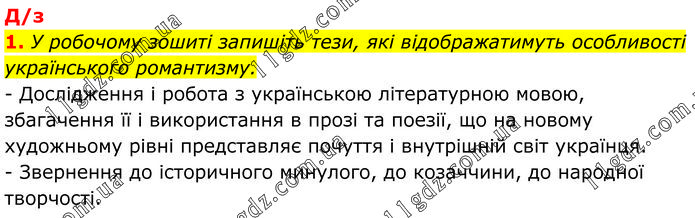 У робочому зошиті запишіть тези, які відображатимуть особливості українського романтизму. – Дослідження і робота з українською літературною мовою, збагачення її і використання в прозі та поезії, що на новому художньому рівні представляє почуття і внутрішній світ українця. – Звернення до історичного минулого, до козаччини, до народної творчості.