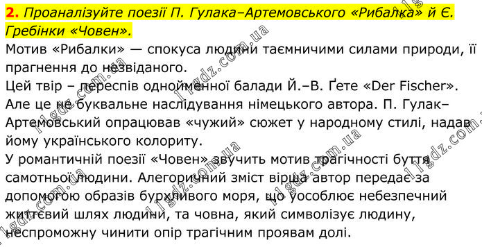 Проаналізуйте поезії П. Гулака–Артемовського «Рибалка» й Є. Гребінки «Човен». Мотив «Рибалки» — спокуса людини таємничими силами природи, її прагнення до незвіданого. Цей твір – переспів однойменної балади Й.–В. Ґете «Der Fischer». Але це не буквальне наслідування німецького автора. П. Гулак–Артемовський опрацював «чужий» сюжет у народному стилі, надав йому українського колориту. У романтичній поезії «Човен» звучить мотив трагічності буття самотньої людини. Алегоричний зміст вірша автор передає за допомогою образів бурхливого моря, що уособлює небезпечний життєвий шлях людини, та човна, який символізує людину, неспроможну чинити опір трагічним проявам долі.
