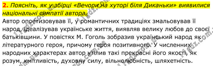 Поясніть, як у збірці «Вечори на хуторі біля Диканьки» виявилися національні симпатії автора. Автор опоетизовував її, у романтичних традиціях змальовував її народ, ідеалізував українське життя, виявляв велику любов до своєї батьківщини. У повістях М. Гоголь зобразив український народ як літературного героя, причому героя позитивного. У численних народних характерах автор утілив такі прекрасні його якості, як розум, кмітливість, духовну силу, вільнолюбність, шляхетність.