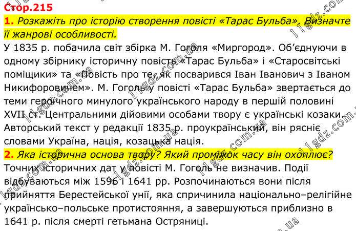 1. Розкажіть про історію створення повісті «Тарас Бульба». Визначте її жанрові особливості. У 1835 р. побачила світ збірка М. Гоголя «Миргород». Об’єднуючи в одному збірнику історичну повість «Тарас Бульба» і «Старосвітські поміщики» та «Повість про те, як посварився Іван Іванович з Іваном Никифоровичем». М. Гоголь у повісті «Тарас Бульба» звертається до теми героїчного минулого українського народу в першій половині XVII ст. Центральними дійовими особами твору є українські козаки. Авторський текст у редакції 1835 р. проукраїнський, він рясніє словами Україна, нація, козацька нація. 2. Яка історична основа твору? Який проміжок часу він охоплює? Точних історичних дат у повісті М. Гоголь не визначив. Події відбуваються між 1596 і 1641 рр. Розпочинаються вони після прийняття Берестейської унії, яка спричинила національно–релігійне українсько–польське протистояння, а завершуються приблизно в 1641 р. після смерті гетьмана Остряниці.