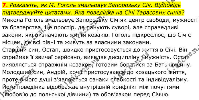 Розкажіть, як М. Гоголь змальовує Запорозьку Січ. Відповідь підтверджуйте цитатами. Яка поведінка на Січі Тарасових синів? Микола Гоголь змальовує Запорозьку Січ як центр свободи, мужності та братерства. Це простір, де панують суворі, але справедливі закони, які визначають життя козаків. Гоголь підкреслює, що Січ є місцем, де всі рівні та живуть за власними законами. Старший син, Остап, швидко пристосовується до життя в Січі. Він сприймає її звичаї серйозно, виявляє дисципліну і мужність. Остап виявляється справжнім козаком, готовим боротися за Батьківщину. Молодший син, Андрій, хоч і пристосувався до козацького життя, проте в його душі з’являються ознаки слабкості та індивідуалізму. Його поведінка відображає внутрішній конфлікт між почуттями (любов’ю до польської дівчини) та обов’язком перед Січчю.