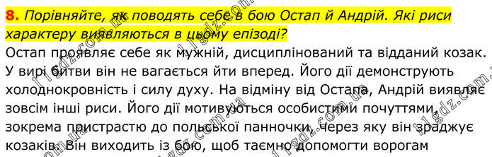 Порівняйте, як поводять себе в бою Остап й Андрій. Які риси характеру виявляються в цьому епізоді? Остап проявляє себе як мужній, дисциплінований та відданий козак. У вирі битви він не вагається йти вперед. Його дії демонструють холоднокровність і силу духу. На відміну від Остапа, Андрій виявляє зовсім інші риси. Його дії мотивуються особистими почуттями, зокрема пристрастю до польської панночки, через яку він зраджує козаків. Він виходить із бою, щоб таємно допомогти ворогам.