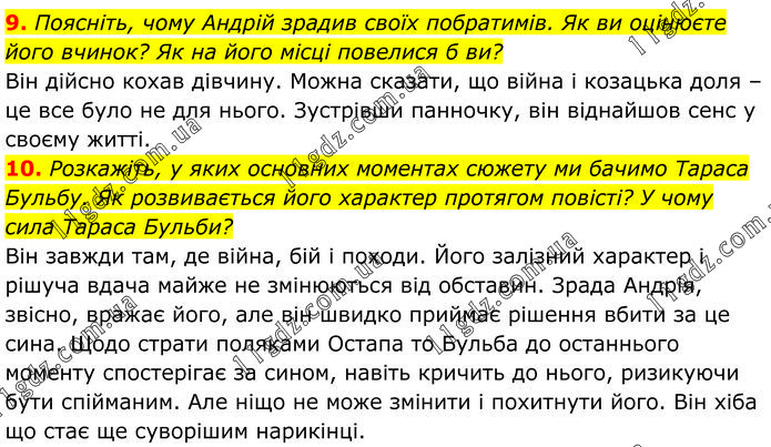 9. Поясніть, чому Андрій зрадив своїх побратимів. Як ви оцінюєте його вчинок? Як на його місці повелися б ви? Він дійсно кохав дівчину. Можна сказати, що війна і козацька доля –це все було не для нього. Зустрівши панночку, він віднайшов сенс у своєму житті. 10. Розкажіть, у яких основних моментах сюжету ми бачимо Тараса Бульбу. Як розвивається його характер протягом повісті? У чому сила Тараса Бульби? Він завжди там, де війна, бій і походи. Його залізний характер і рішуча вдача майже не змінюються від обставин. Зрада Андрія, звісно, вражає його, але він швидко приймає рішення вбити за це сина. Щодо страти поляками Остапа то Бульба до останнього моменту спостерігає за сином, навіть кричить до нього, ризикуючи бути спійманим. Але ніщо не може змінити і похитнути його. Він хіба що стає ще суворішим наприкінці.