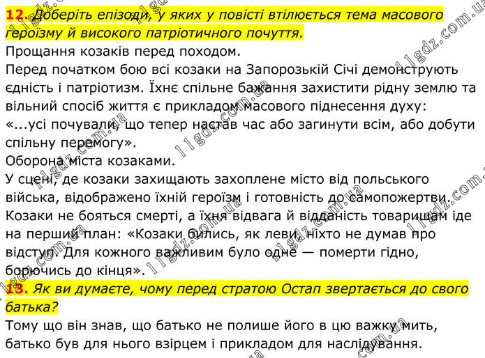 12. Доберіть епізоди, у яких у повісті втілюється тема масового героїзму й високого патріотичного почуття. Прощання козаків перед походом. Перед початком бою всі козаки на Запорозькій Січі демонструють єдність і патріотизм. Їхнє спільне бажання захистити рідну землю та вільний спосіб життя є прикладом масового піднесення духу: «...усі почували, що тепер настав час або загинути всім, або добути спільну перемогу». Оборона міста козаками. У сцені, де козаки захищають захоплене місто від польського війська, відображено їхній героїзм і готовність до самопожертви. Козаки не бояться смерті, а їхня відвага й відданість товаришам іде на перший план: «Козаки бились, як леви, ніхто не думав про відступ. Для кожного важливим було одне — померти гідно, борючись до кінця». 13. Як ви думаєте, чому перед стратою Остап звертається до свого батька? Тому що він знав, що батько не полише його в цю важку мить, батько був для нього взірцем і прикладом для наслідування.