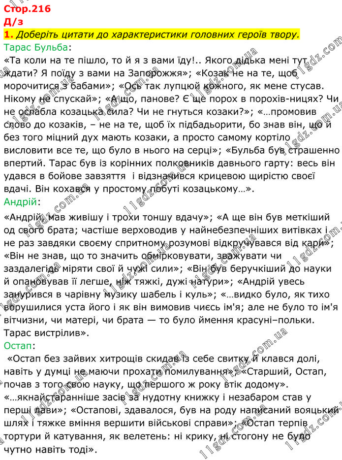 Доберіть цитати до характеристики головних героїв твору. Тарас Бульба: «Та коли на те пішло, то й я з вами їду!.. Якого дідька мені тут ждати? Я поїду з вами на Запорожжя»; «Козак не на те, щоб морочитися з бабами»; «Ось так лупцюй кожного, як мене стусав. Нікому не спускай»; «А що, панове? Є ще порох в порохівницях? Чи не ослабла козацька сила? Чи не гнуться козаки?»; «…промовив слово до козаків, – не на те, щоб їх підбадьорити, бо знав він, що й без того міцний дух мають козаки, а просто самому кортіло висловити все те, що було в нього на серці»; «Бульба був страшенно впертий. Тарас був із корінних полковників давнього гарту: весь він удався в бойове завзяття і відзначився крицевою щирістю своєї вдачі. Він кохався у простому побуті козацькому…». Андрій: «Андрій, мав живішу і трохи тоншу вдачу»; «А ще він був меткіший од свого брата; частіше верховодив у найнебезпечніших витівках і не раз завдяки своєму спритному розумові відкручувався від кари»; «Він не знав, що то значить обмірковувати, зважувати чи заздалегідь міряти свої й чужі сили»; «Він був беручкіший до науки й опановував її легше, ніж тяжкі, дужі натури»; «Андрій увесь занурився в чарівну музику шабель і куль»; «…видко було, як тихо ворушилися уста його і як він вимовив чиєсь ім'я; але не було то ім'я вітчизни, чи матері, чи брата — то було ймення красуні–польки. Тарас вистрілив». Остап: «Остап без зайвих хитрощів скидав із себе свитку й клався долі, навіть у думці не маючи прохати помилування»; «Старший, Остап, почав з того свою науку, що першого ж року втік додому». «…якнайстаранніше засів за нудотну книжку і незабаром став у перші лави»; «Остапові, здавалося, був на роду написаний вояцький шлях і тяжке вміння вершити військові справи»; «Остап терпів тортури й катування, як велетень: ні крику, ні стогону не було чутно навіть тоді».