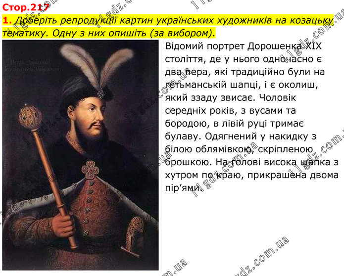 Доберіть репродукції картин українських художників на козацьку тематику. Одну з них опишіть (за вибором). Відомий портрет Дорошенка ХІХ століття, де у нього одночасно є два пера, які традиційно були на гетьманській шапці, і є околиш, який ззаду звисає. Чоловік середніх років, з вусами та бородою, в лівій руці тримає булаву. Одягнений у накидку з білою облямівкою, скріпленою брошкою. На голові висока шапка з хутром по краю, прикрашена двома пір’ями.