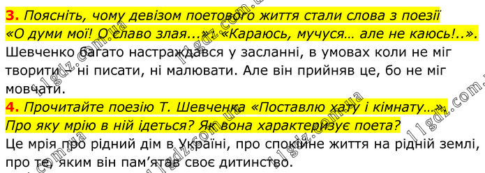 3. Поясніть, чому девізом поетового життя стали слова з поезії «О думи мої! О славо злая...»: «Караюсь, мучуся… але не каюсь!..». Шевченко багато настраждався у засланні, в умовах коли не міг творити – ні писати, ні малювати. Але він прийняв це, бо не міг мовчати. 4. Прочитайте поезію Т. Шевченка «Поставлю хату і кімнату…». Про яку мрію в ній ідеться? Як вона характеризує поета? Це мрія про рідний дім в Україні, про спокійне життя на рідній землі, про те, яким він пам’ятав своє дитинство.