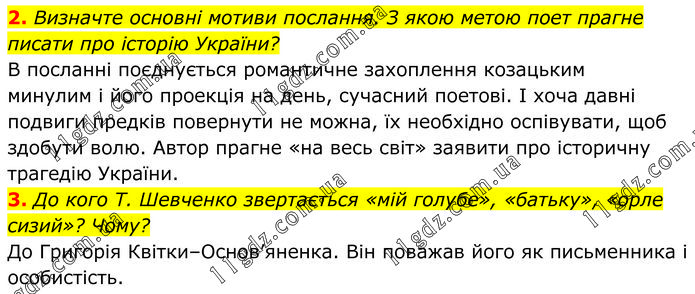 2. Визначте основні мотиви послання. З якою метою поет прагне писати про історію України? В посланні поєднується романтичне захоплення козацьким минулим і його проекція на день, сучасний поетові. І хоча давні подвиги предків повернути не можна, їх необхідно оспівувати, щоб здобути волю. Автор прагне «на весь світ» заявити про історичну трагедію України. 3. До кого Т. Шевченко звертається «мій голубе», «батьку», «орле сизий»? Чому? До Григорія Квітки–Основ’яненка. Він поважав його як письменника і особистість.