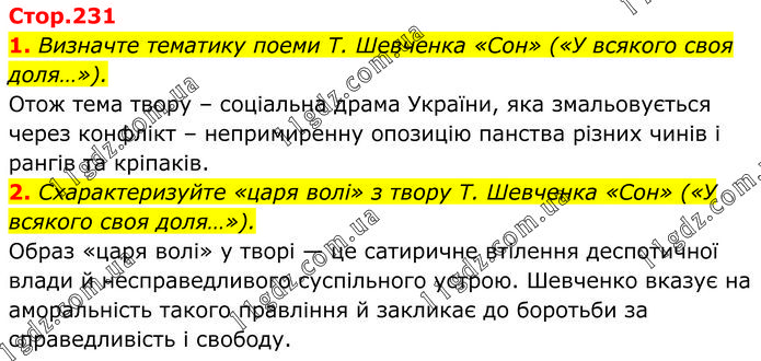 1. Визначте тематику поеми Т. Шевченка «Сон» («У всякого своя доля…»). Отож тема твору – соціальна драма України, яка змальовується через конфлікт – непримиренну опозицію панства різних чинів і рангів та кріпаків. 2. Схарактеризуйте «царя волі» з твору Т. Шевченка «Сон» («У всякого своя доля…»). Образ «царя волі» у творі — це сатиричне втілення деспотичної влади й несправедливого суспільного устрою. Шевченко вказує на аморальність такого правління й закликає до боротьби за справедливість і свободу.