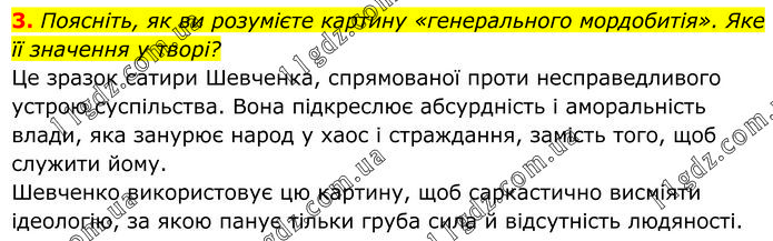 Поясніть, як ви розумієте картину «генерального мордобитія». Яке її значення у творі? Це зразок сатири Шевченка, спрямованої проти несправедливого устрою суспільства. Вона підкреслює абсурдність і аморальність влади, яка занурює народ у хаос і страждання, замість того, щоб служити йому. Шевченко використовує цю картину, щоб саркастично висміяти ідеологію, за якою панує тільки груба сила й відсутність людяності.