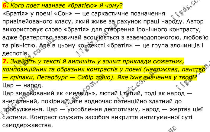 6. Кого поет називає «братією» й чому? «Братія» у поемі «Сон» — це саркастичне позначення привілейованого класу, який живе за рахунок праці народу. Автор використовує слово «братія» для створення іронічного контрасту, адже братерство зазвичай асоціюється з взаємодопомогою, любов’ю та рівністю. Але в цьому контексті «братія» — це група злочинців і деспотів. 7. Знайдіть у тексті й випишіть у зошит приклади сюжетних, композиційних та образних контрастів у поемі (наприклад, панство — кріпаки, Петербург — Сибір тощо). Яке їхнє значення у творі? Цар — народ. Цар змальований як «медвідь», лютий і тупий, тоді як народ — знесилений, покірний, але водночас потенційно здатний до пробудження. Цар — уособлення деспотизму, народ — жертва цієї системи. Контраст служить засобом викриття антигуманної суті самодержавства.