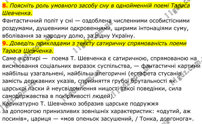 8. Поясніть роль умовного засобу сну в однойменній поемі Тараса Шевченка. Фантастичний політ у сні — оздоблена численними особистісними роздумами, душевними одкровеннями, щирими інтонаціями суму, вболівання за народну долю, за рідну Україну. 9. Доведіть прикладами з тексту сатиричну спрямованість поеми Тараса Шевченка. Саме в сатирі — поема Т. Шевченка є сатиричною, спрямованою на висміювання соціальних виразок суспільства, — фантастичні картини найбільш узагальнені, найбільш алегоричні (естафета стусанів замість державних указів, сприйняття грубої брутальності як царської ласки й неусвідомлення ницості такої поведінки, сила самодержавства в покірливості людей). Карикатурно Т. Шевченко зобразив царське подружжя за допомогою принизливих зовнішніх характеристик: «одутий, аж посинів», цариця — «мов опеньок засушений, / Тонка, довгонога».