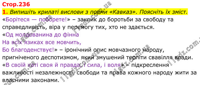 Випишіть крилаті вислови з поеми «Кавказ». Поясніть їх зміст. «Борітеся — поборете!» – заклик до боротьби за свободу та справедливість, віра у перемогу тих, хто не здається. «Од молдованина до фінна На всіх язиках все мовчить, Бо благоденствує!» – іронічний опис мовчазного народу, пригніченого деспотизмом, який змушений терпіти свавілля влади. «В своїй хаті своя й правда, і сила, і воля» – підкреслення важливості незалежності, свободи та права кожного народу жити за власними законами.