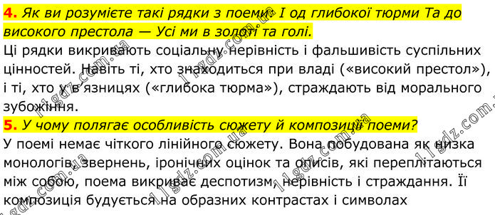 4. Як ви розумієте такі рядки з поеми: І од глибокої тюрми Та до високого престола — Усі ми в золоті та голі. Ці рядки викривають соціальну нерівність і фальшивість суспільних цінностей. Навіть ті, хто знаходиться при владі («високий престол»), і ті, хто у в’язницях («глибока тюрма»), страждають від морального зубожіння. 5. У чому полягає особливість сюжету й композиції поеми? У поемі немає чіткого лінійного сюжету. Вона побудована як низка монологів, звернень, іронічних оцінок та описів, які переплітаються між собою, поема викриває деспотизм, нерівність і страждання. Її композиція будується на образних контрастах і символах.
