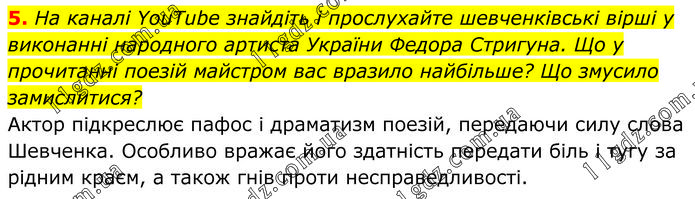 На каналі YouTube знайдіть і прослухайте шевченківські вірші у виконанні народного артиста України Федора Стригуна. Що у прочитанні поезій майстром вас вразило найбільше? Що змусило замислитися? Актор підкреслює пафос і драматизм поезій, передаючи силу слова Шевченка. Особливо вражає його здатність передати біль і тугу за рідним краєм, а також гнів проти несправедливості.