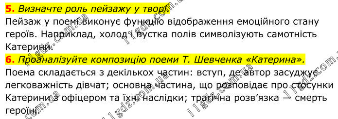 5. Визначте роль пейзажу у творі. Пейзаж у поемі виконує функцію відображення емоційного стану героїв. Наприклад, холод і пустка полів символізують самотність Катерини. 6. Проаналізуйте композицію поеми Т. Шевченка «Катерина». Поема складається з декількох частин: вступ, де автор засуджує легковажність дівчат; основна частина, що розповідає про стосунки Катерини з офіцером та їхні наслідки; трагічна розв’язка — смерть героїні.