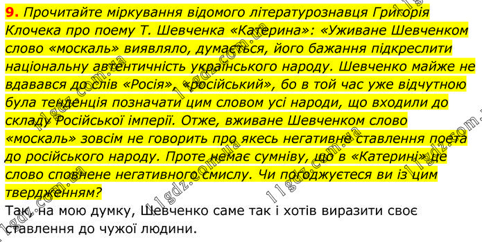 Прочитайте міркування відомого літературознавця Григорія Клочека про поему Т. Шевченка «Катерина»: «Уживане Шевченком слово «москаль» виявляло, думається, його бажання підкреслити національну автентичність українського народу. Шевченко майже не вдавався до слів «Росія», «російський», бо в той час уже відчутною була тенденція позначати цим словом усі народи, що входили до складу Російської імперії. Отже, вживане Шевченком слово «москаль» зовсім не говорить про якесь негативне ставлення поета до російського народу. Проте немає сумніву, що в «Катерині» це слово сповнене негативного смислу. Чи погоджуєтеся ви із цим твердженням? Так, на мою думку, Шевченко саме так і хотів виразити своє ставлення до чужої людини.