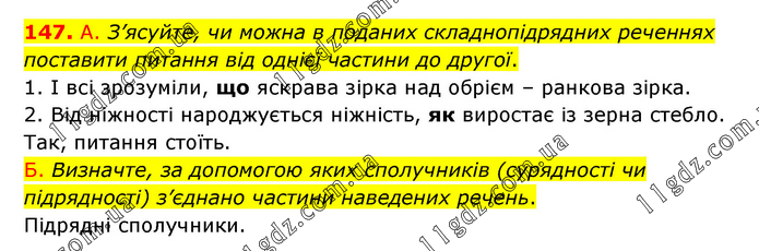 147. А. З’ясуйте, чи можна в поданих складнопідрядних реченнях поставити питання від однієї частини до другої. 1. І всі зрозуміли, що яскрава зірка над обрієм – ранкова зірка. 2. Від ніжності народжується ніжність, як виростає із зерна стебло. Так, питання стоїть. Б. Визначте, за допомогою яких сполучників (сурядності чи підрядності) з’єднано частини наведених речень. Підрядні сполучники.