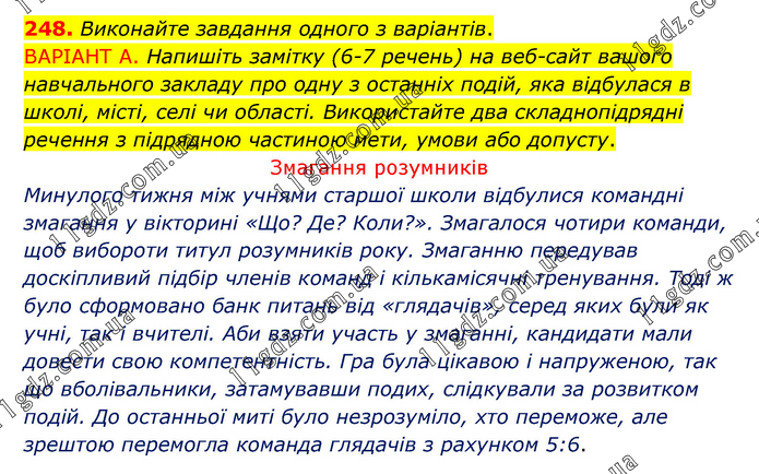 Виконайте завдання одного з варіантів. ВАРІАНТ А. Напишіть замітку (6-7 речень) на веб-сайт вашого навчального закладу про одну з останніх подій, яка відбулася в школі, місті, селі чи області. Використайте два складнопідрядні речення з підрядною частиною мети, умови або допусту. Змагання розумників Минулого тижня між учнями старшої школи відбулися командні змагання у вікторині «Що? Де? Коли?». Змагалося чотири команди, щоб вибороти титул розумників року. Змаганню передував доскіпливий підбір членів команд і кількамісячні тренування. Тоді ж було сформовано банк питань від «глядачів», серед яких були як учні, так і вчителі. Аби взяти участь у змаганні, кандидати мали довести свою компетентність. Гра була цікавою і напруженою, так що вболівальники, затамувавши подих, слідкували за розвитком подій. До останньої миті було незрозуміло, хто переможе, але зрештою перемогла команда глядачів з рахунком 5:6.