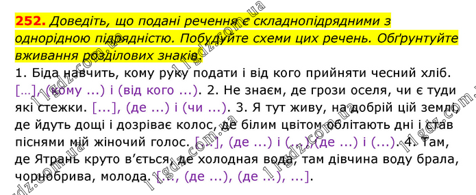 Доведіть, що подані речення є складнопідрядними з однорідною підрядністю. Побудуйте схеми цих речень. Обґрунтуйте вживання розділових знаків. 1. Біда навчить, кому руку подати і від кого прийняти чесний хліб. […], (кому ...) і (від кого ...). 2. Не знаєм, де грози оселя, чи є туди які стежки. [...], (де ...) і (чи ...). 3. Я тут живу, на добрій цій землі, де йдуть дощі і дозріває колос, де білим цвітом облітають дні і став піснями мій жіночий голос. [...], (де ...) і (...),(де ...) і (...). 4. Там, де Ятрань круто в’ється, де холодная вода, там дівчина воду брала, чорнобрива, молода. [..., (де ...), (де ...), ...].