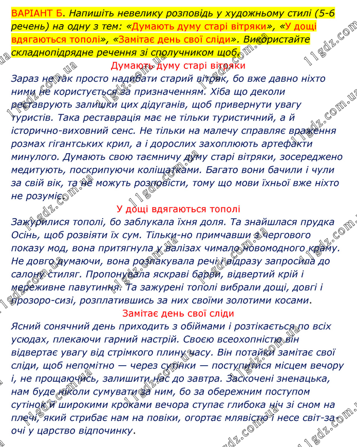 ВАРІАНТ Б. Напишіть невелику розповідь у художньому стилі (5-6 речень) на одну з тем: «Думають думу старі вітряки», «У дощі вдягаються тополі», «Замітає день свої сліди». Використайте складнопідрядне речення зі сполучником щоб. Думають думу старі вітряки Зараз не так просто надибати старий вітряк, бо вже давно ніхто ними не користується за призначенням. Хіба що деколи реставрують залишки цих дідуганів, щоб привернути увагу туристів. Така реставрація має не тільки туристичний, а й історично-виховний сенс. Не тільки на малечу справляє враження розмах гігантських крил, а і дорослих захоплюють артефакти минулого. Думають свою таємничу думу старі вітряки, зосереджено медитують, поскрипуючи коліщатками. Багато вони бачили і чули за свій вік, та не можуть розповісти, тому що мови їхньої вже ніхто не розуміє. У дощі вдягаються тополі Зажурилися тополі, бо заблукала їхня доля. Та знайшлася прудка Осінь, щоб розвіяти їх сум. Тільки-но примчавши з чергового показу мод, вона притягнула у валізах чимало новомодного краму. Не довго думаючи, вона розпакувала речі і відразу запросила до салону стиляг. Пропонувала яскраві барви, відвертий крій і мереживне павутиння. Та зажурені тополі вибрали дощі, довгі і прозоро-сизі, розплатившись за них своїми золотими косами. Замітає день свої сліди Ясний сонячний день приходить з обіймами і розтікається по всіх усюдах, плекаючи гарний настрій. Своєю всеохопністю він відвертає увагу від стрімкого плину часу. Він потайки замітає свої сліди, щоб непомітно — через сутінки — поступитися місцем вечору і, не прощаючись, залишити нас до завтра. Заскочені зненацька, нам буде ніколи сумувати за ним, бо за обережним поступом сутінок й широкими кроками вечора ступає глибока ніч зі сном на плечі, який стрибає нам на повіки, огортає млявістю і несе світ-за-очі у царство відпочинку.