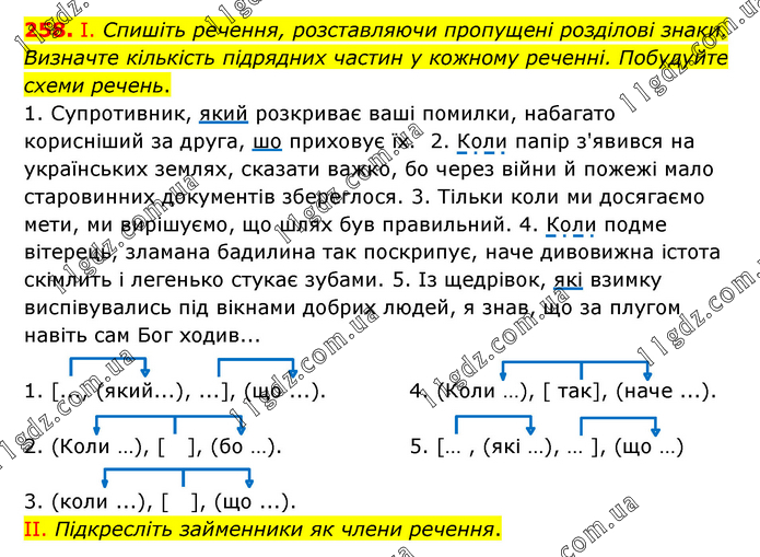 І. Спишіть речення, розставляючи пропущені розділові знаки. Визначте кількість підрядних частин у кожному реченні. Побудуйте схеми речень. 1. Супротивник, який розкриває ваші помилки, набагато корисніший за друга, шо приховує їх. 2. Коли папір з'явився на українських землях, сказати важко, бо через війни й пожежі мало старовинних документів збереглося. 3. Тільки коли ми досягаємо мети, ми вирішуємо, що шлях був правильний. 4. Коли подме вітерець, зламана бадилина так поскрипує, наче дивовижна істота скімлить і легенько стукає зубами. 5. Із щедрівок, які взимку виспівувались під вікнами добрих людей, я знав, що за плугом навіть сам Бог ходив...
