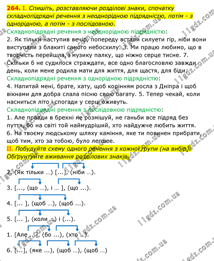 І. Спишіть, розставляючи розділові знаки, спочатку складнопідрядні речення з неоднорідною підрядністю, потім - з однорідною, а потім - з послідовною. Складнопідрядні речення з неоднорідною підрядністю: 2. Як тільки наступив вечір, попереду встали силуети гір, ніби вони виступали з блакиті самого небосхилу. 3. Ми працю любимо, що в творчість перейшла, і музику палку, що ніжно серце тисне. 7. Скільки б не судилося страждати, все одно благословлю завжди день, коли мене родила мати для життя, для щастя, для біди. Складнопідрядні речення з однорідною підрядністю: 4. Напитай мені, брате, хату, щоб корінням росла з Дніпра і щоб вікнами для добра слала пісню свою багату. 5. Тепер чекай, коли насниться літо і спогади у серці оживуть. Складнопідрядні речення з послідовною підрядністю: 1. Але правди в брехні не розмішуй, не ганьби все підряд без пуття, бо на світі той наймудріший, хто найдужче любить життя. 6. На твоєму людському шляху каміння, яке ти повинен прибрати, щоб тим, хто за тобою, було легшее. ІІ. Побудуйте схему одного речення з кожної групи (на вибір). Обґрунтуйте вживання розділових знаків. 2. (Як тільки …) [...], (ніби …). 3. [..., (що …), і … ], (що ...). 4. [... ], (щоб …), (щоб ...). 5. [... ], (коли …) і (...). 1. [Але ...], (бо ...), (хто …). 6. [...], (яке ...), (щоб …), (щоб …)
