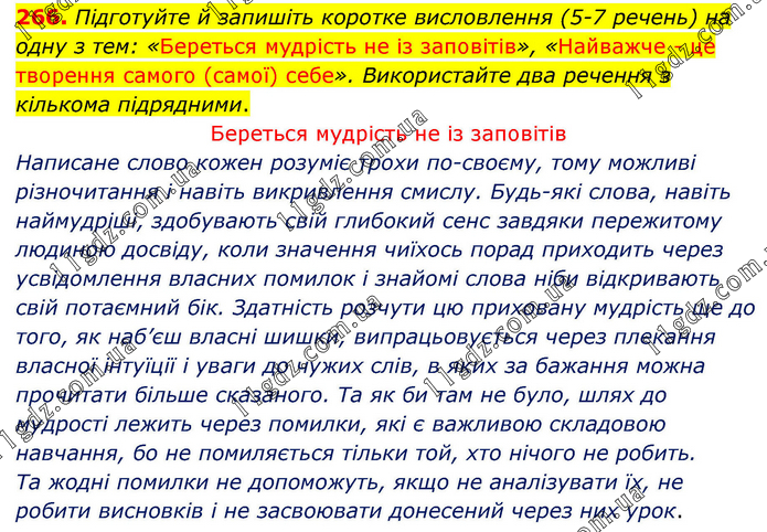 Підготуйте й запишіть коротке висловлення (5-7 речень) на одну з тем: «Береться мудрість не із заповітів», «Найважче - це творення самого (самої) себе». Використайте два речення з кількома підрядними. Береться мудрість не із заповітів Написане слово кожен розуміє трохи по-своєму, тому можливі різночитання і навіть викривлення смислу. Будь-які слова, навіть наймудріші, здобувають свій глибокий сенс завдяки пережитому людиною досвіду, коли значення чиїхось порад приходить через усвідомлення власних помилок і знайомі слова ніби відкривають свій потаємний бік. Здатність розчути цю приховану мудрість ще до того, як наб’єш власні шишки, випрацьовується через плекання власної інтуїції і уваги до чужих слів, в яких за бажання можна прочитати більше сказаного. Та як би там не було, шлях до мудрості лежить через помилки, які є важливою складовою навчання, бо не помиляється тільки той, хто нічого не робить. Та жодні помилки не допоможуть, якщо не аналізувати їх, не робити висновків і не засвоювати донесений через них урок.