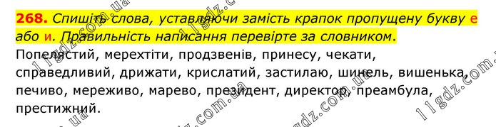 Спишіть слова, уставляючи замість крапок пропущену букву е або и. Правильність написання перевірте за словником. Попелястий, мерехтіти, продзвенів, принесу, чекати, справедливий, дрижати, крислатий, застилаю, шинель, вишенька, печиво, мереживо, марево, президент, директор, преамбула, престижний.