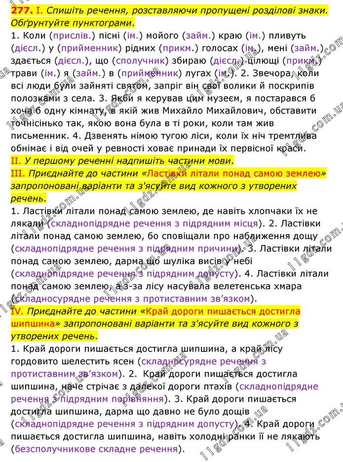 І. Спишіть речення, розставляючи пропущені розділові знаки. Обґрунтуйте пунктограми. 1. Коли (прислів.) пісні (ім.) мойого (займ.) краю (ім.) пливуть (дієсл.) у (прийменник) рідних (прикм.) голосах (ім.), мені (займ.) здається (дієсл.), що (сполучник) збираю (дієсл.) цілющі (прикм.) трави (ім.) я (займ.) в (прийменник) лугах (ім.). 2. Звечора, коли всі люди були зайняті святом, запріг він свої волики й поскрипів полозками з села. 3. Якби я керував цим музеєм, я постарався б хоча б одну кімнату, в якій жив Михайло Михайлович, обставити точнісінько так, якою вона була в ті роки, коли там жив письменник. 4. Дзвенять німою тугою ліси, коли їх ніч тремтлива обнімає і від очей у ревності ховає принади їх первісної краси. II. У першому реченні надпишіть частини мови. ІІІ. Приєднайте до частини «Ластівки літали понад самою землею» запропоновані варіанти та з'ясуйте вид кожного з утворених речень. 1. Ластівки літали понад самою землею, де навіть хлопчаки їх не лякали (складнопідрядне речення з підрядним місця). 2. Ластівки літали понад самою землею, бо сповіщали про наближення дощу (складнопідрядне речення з підрядним причини). 3. Ластівки літали понад самою землею, дарма що шуліка висів у небі (складнопідрядне речення з підрядним допусту). 4. Ластівки літали понад самою землею, а з-за лісу насувала велетенська хмара (складносурядне речення з протиставним зв’язком). ІV. Приєднайте до частини «Край дороги пишається достигла шипшина» запропоновані варіанти та з'ясуйте вид кожного з утворених речень. 1. Край дороги пишається достигла шипшина, а край лісу гордовито шелестить ясен (складносурядне речення з протиставним зв’язком). 2. Край дороги пишається достигла шипшина, наче стрічає з далекої дороги птахів (складнопідрядне речення з підрядним порівняння). 3. Край дороги пишається достигла шипшина, дарма що давно не було дощів (складнопідрядне речення з підрядним допусту). 4. Край дороги пишається достигла шипшина, навіть холодні ранки її не лякають (безсполучникове складне речення).