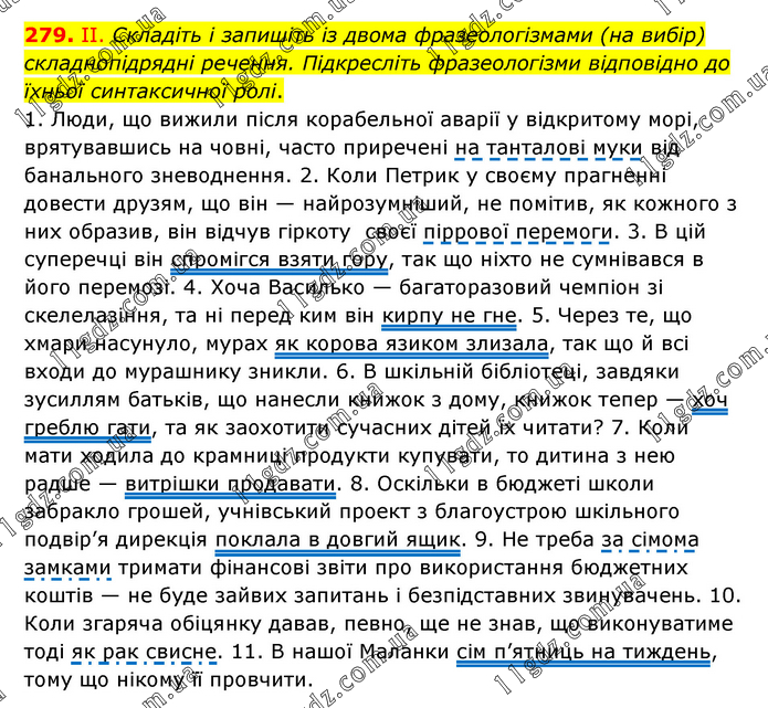 ІІ. Складіть і запишіть із двома фразеологізмами (на вибір) складнопідрядні речення. Підкресліть фразеологізми відповідно до їхньої синтаксичної ролі. 1. Люди, що вижили після корабельної аварії у відкритому морі, врятувавшись на човні, часто приречені на танталові муки від банального зневоднення. 2. Коли Петрик у своєму прагненні довести друзям, що він — найрозумніший, не помітив, як кожного з них образив, він відчув гіркоту своєї піррової перемоги. 3. В цій суперечці він спромігся взяти гору, так що ніхто не сумнівався в його перемозі. 4. Хоча Василько — багаторазовий чемпіон зі скелелазіння, та ні перед ким він кирпу не гне. 5. Через те, що хмари насунуло, мурах як корова язиком злизала, так що й всі входи до мурашнику зникли. 6. В шкільній бібліотеці, завдяки зусиллям батьків, що нанесли книжок з дому, книжок тепер — хоч греблю гати, та як заохотити сучасних дітей їх читати? 7. Коли мати ходила до крамниці продукти купувати, то дитина з нею радше — витрішки продавати. 8. Оскільки в бюджеті школи забракло грошей, учнівський проект з благоустрою шкільного подвір’я дирекція поклала в довгий ящик. 9. Не треба за сімома замками тримати фінансові звіти про використання бюджетних коштів — не буде зайвих запитань і безпідставних звинувачень. 10. Коли згаряча обіцянку давав, певно, ще не знав, що виконуватиме тоді як рак свисне. 11. В нашої Маланки сім п’ятниць на тиждень, тому що нікому її провчити.