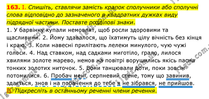 І. Спишіть, ставлячи замість крапок сполучники або сполучні слова відповідно до зазначеного в квадратних дужках виду підрядної частини. Поставте розділові знаки. 1. У барвінку купали немовлят, щоб росли здоровими та щасливими. 2. Йому здавалося, що їхатимуть цілу вічність без кінця і краю. 3. Коли навесні прилітають лелеки минулого, чую чужі голоси. 4. Над ставком, над садками миготіло, грало, лилося хвилями золоте марево, немов на повітрі ворушились якісь пасма тонких золотих ниточок. 5. Вони танцювали доти, поки зовсім потомилися. 6. Пробач мені, серпневий стене, тому що завинив, здається, знов і на побачення до тебе я не зібрався, не прийшов. ІІ. Підкресліть в останньому реченні члени речення.