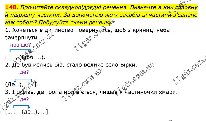 148. Прочитайте складнопідрядні речення. Визначте в них головну й підрядну частини. За допомогою яких засобів ці частини з'єднано між собою? Побудуйте схеми речень. 1. Хочеться в дитинство повернутись, щоб з криниці неба зачерпнути. навіщо? [ ] , (щоб ...). 2. Де був колись бір, стало велике село Бірки. де? (Де…), [ ]. 3. І скрізь, де тропа мол в’ється, лишав я частиночки хмари. де? [… , (де…), …].