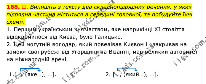 ІІ. Випишіть з тексту два складнопідрядних речення, у яких підрядна частина міститься в середині головної, та побудуйте їхні схеми. 1. Першим українським князівством, яке наприкінці XI століття відокремилося від Києва, було Галицьке. 2. Цей могутній володар, який повелівав Києвом і «закривав на замок» свої рубежі від Угорщини та Візантії, мав великии авторитет на міжнародній арені.