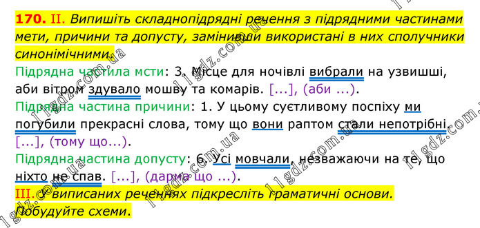 ІІ. Випишіть складнопідрядні речення з підрядними частинами мети, причини та допусту, замінивши використані в них сполучники синонімічними. Підрядна частила мсти: 3. Місце для ночівлі вибрали на узвишші, аби вітром здувало мошву та комарів. [...], (аби ...). Підрядна частина причини: 1. У цьому суєтливому поспіху ми погубили прекрасні слова, тому що вони раптом стали непотрібні. [...], (тому що...). Підрядна частина допусту: 6. Усі мовчали, незважаючи на те, що ніхто не спав. [...], (дарма що ...). III. У виписаних реченнях підкресліть граматичні основи. Побудуйте схеми.