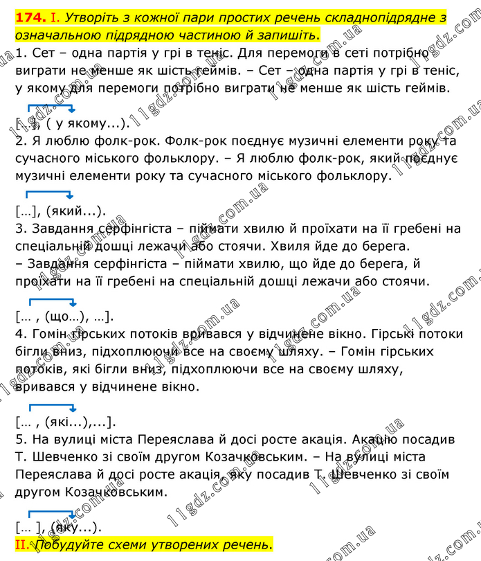 І. Утворіть з кожної пари простих речень складнопідрядне з означальною підрядною частиною й запишіть. 1. Сет – одна партія у грі в теніс. Для перемоги в сеті потрібно виграти не менше як шість геймів. – Сет – одна партія у грі в теніс, у якому для перемоги потрібно виграти не менше як шість геймів. […], ( у якому...). 2. Я люблю фолк-рок. Фолк-рок поєднує музичні елементи року та сучасного міського фольклору. – Я люблю фолк-рок, який поєднує музичні елементи року та сучасного міського фольклору. […], (який...). 3. Завдання серфінгіста – піймати хвилю й проїхати на її гребені на спеціальній дошці лежачи або стоячи. Хвиля йде до берега. – Завдання серфінгіста – піймати хвилю, що йде до берега, й проїхати на її гребені на спеціальній дошці лежачи або стоячи. [… , (що…), …]. 4. Гомін гірських потоків вривався у відчинене вікно. Гірські потоки бігли вниз, підхоплюючи все на своєму шляху. – Гомін гірських потоків, які бігли вниз, підхоплюючи все на своєму шляху, вривався у відчинене вікно. [… , (які...),...]. 5. На вулиці міста Переяслава й досі росте акація. Акацію посадив Т. Шевченко зі своїм другом Козачковським. – На вулиці міста Переяслава й досі росте акація, яку посадив Т. Шевченко зі своїм другом Козачковським. [… ], (яку...). ІІ. Побудуйте схеми утворених речень.