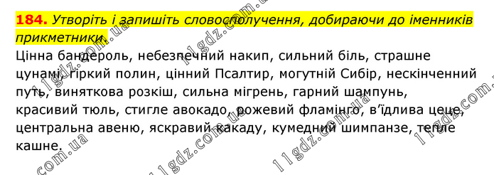 Утворіть і запишіть словосполучення, добираючи до іменників прикметники. Цінна бандероль, небезпечний накип, сильний біль, страшне цунамі, гіркий полин, цінний Псалтир, могутній Сибір, нескінченний путь, виняткова розкіш, сильна мігрень, гарний шампунь, красивий тюль, стигле авокадо, рожевий фламінго, в’їдлива цеце, центральна авеню, яскравий какаду, кумедний шимпанзе, тепле кашне.