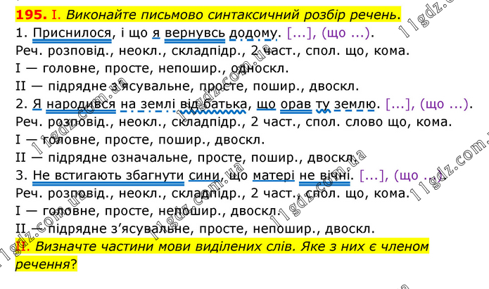 І. Виконайте письмово синтаксичний розбір речень. 1. Приснилося, і що я вернувсь додому. [...], (що ...). Реч. розповід., неокл., складпідр., 2 част., спол. що, кома. I — головне, просте, непошир., односкл. II — підрядне з’ясувальне, просте, пошир., двоскл. 2. Я народився на землі від батька, що орав ту землю. [...], (що ...). Реч. розповід., неокл., складпідр., 2 част., спол. слово що, кома. I — головне, просте, пошир., двоскл. II — підрядне означальне, просте, пошир., двоскл. 3. Не встигають збагнути сини, що матері не вічні. [...], (що ...). Реч. розповід., неокл., складпідр., 2 част., спол. що, кома. I — головне, просте, непошир., двоскл. II — підрядне з’ясувальне, просте, непошир., двоскл. ІІ. Визначте частини мови виділених слів. Яке з них є членом речення?